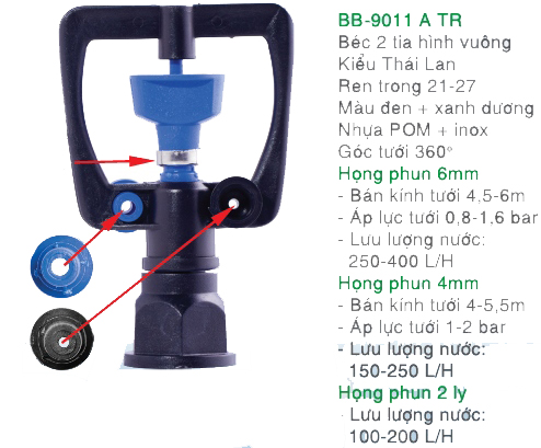 Béc 2 tia hình vuông kiểu Thailand được dùng rộng rãi trong thiết kế HỆ THỐNG TƯỚI TIẾT KIỆM bởi lợi ích: Lắp đặt dễ dàng nhanh chóng nên tiết kiệm thời gian, tiết kiệm tiền và tiết kiệm nước tưới. Có thể dùng với nhiều loại ống dẫn nước như: ống PVC 21 đến 27, ống PE 16 và 20, ống PE mềm 5 ly đến 10 ly. Linh hoạt khi cần phải cải tạo đất, thu hoạch hoa màu hay chuyển đổi đối tượng tưới