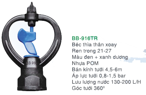 Béc thìa thân xoay được dùng rộng rãi trong thiết kế HỆ THỐNG TƯỚI TIẾT KIỆM bởi lợi ích: Lắp đặt dễ dàng nhanh chóng nên tiết kiệm thời gian, tiết kiệm tiền và tiết kiệm nước tưới. Có thể dùng với nhiều loại ống dẫn nước như: ống PVC 21 đến 27, ống PE 16 và 20, ống PE mềm 5 ly đến 10 ly. Linh hoạt khi cần phải cải tạo đất, thu hoạch hoa màu hay chuyển đổi đối tượng tưới